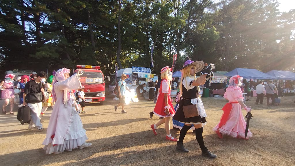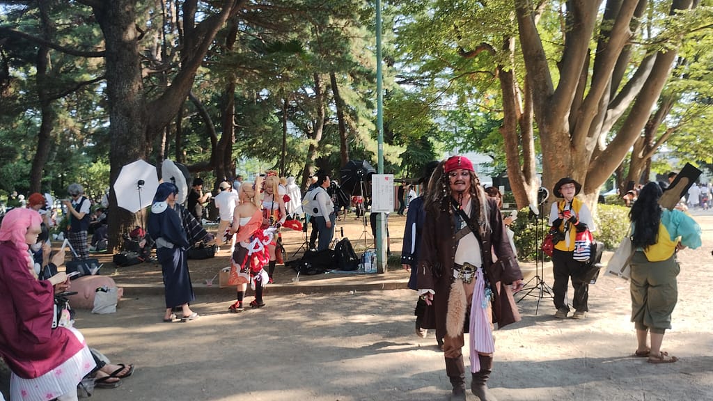 猛暑の公園内では色とりどりのコスプレをした人びとが集い、真夏の一日を謳歌していました。