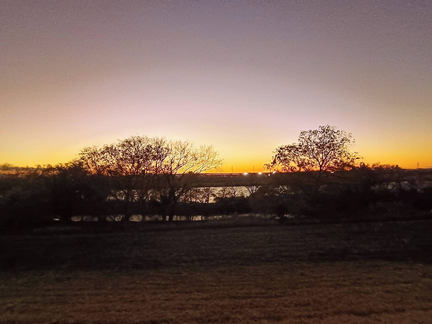 西の空が鮮やかなオレンジ色から深い藍色へと移り変わるグラデーションは、まさに自然が織りなすアート。水面に反射する残光と、静かに佇む水門や木々のシルエットが重なり、どこか懐かしく幻想的な情景を映し出しています。​
