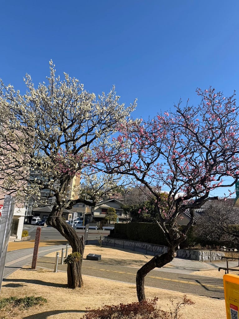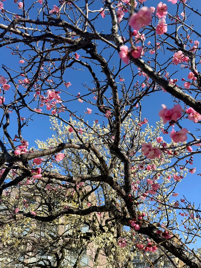 足を止めて見上げると、冬の澄み切った青空に黄梅と紅梅のコントラストが美しく映え、ひと足早い春の気配を実感させてくれます。