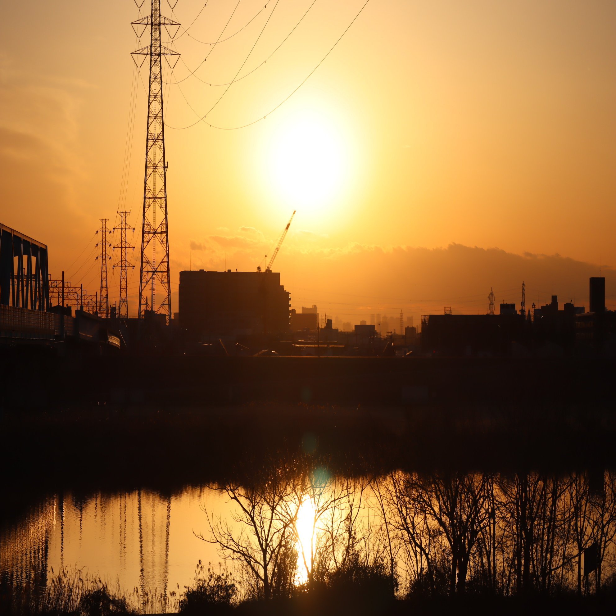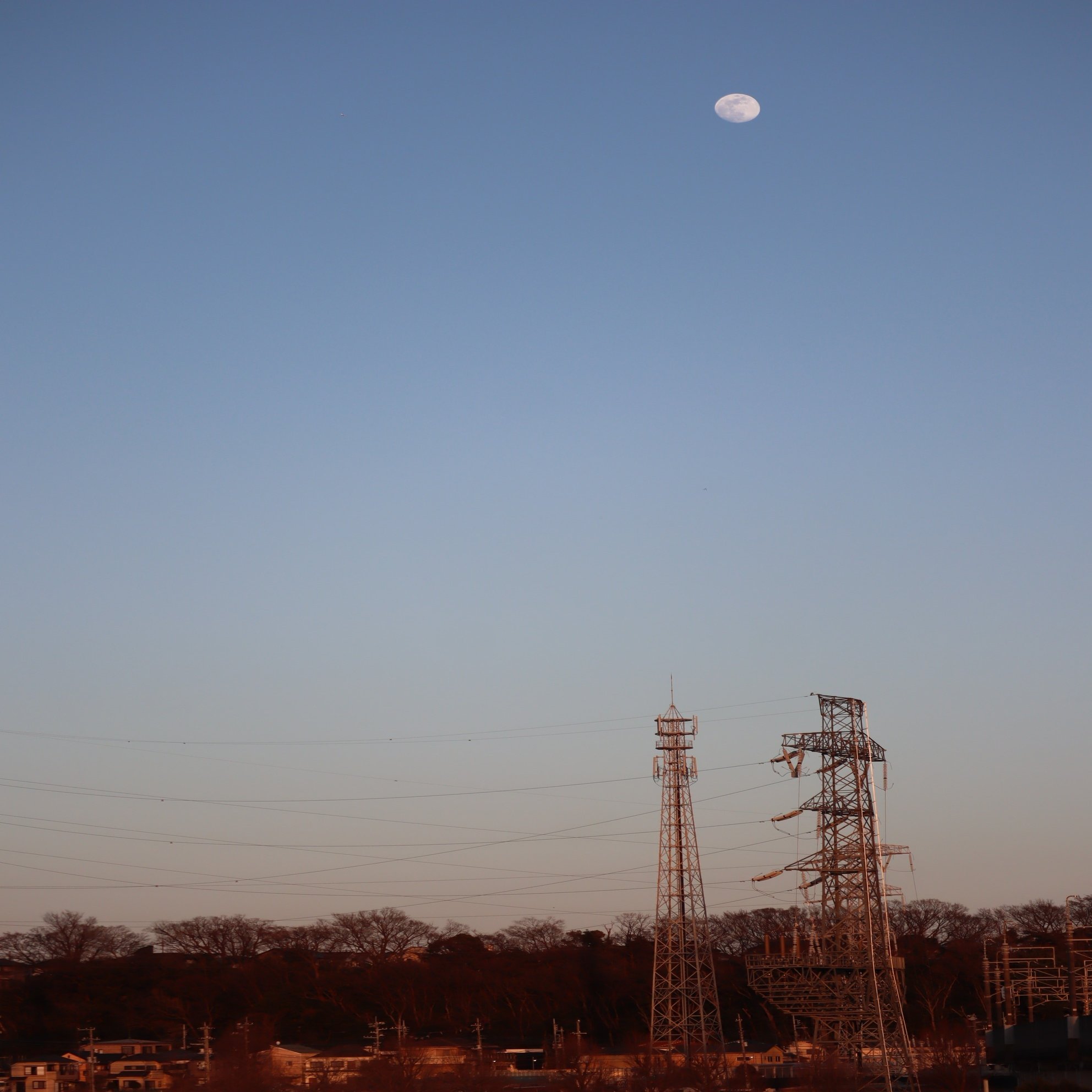 写真は、冬の江戸川堤を定点として東京都方面や矢切地区の低地と台地を挟む斜面林の方面に向かって太陽・水面・送電線・月・人物・建物などを撮影しています。
