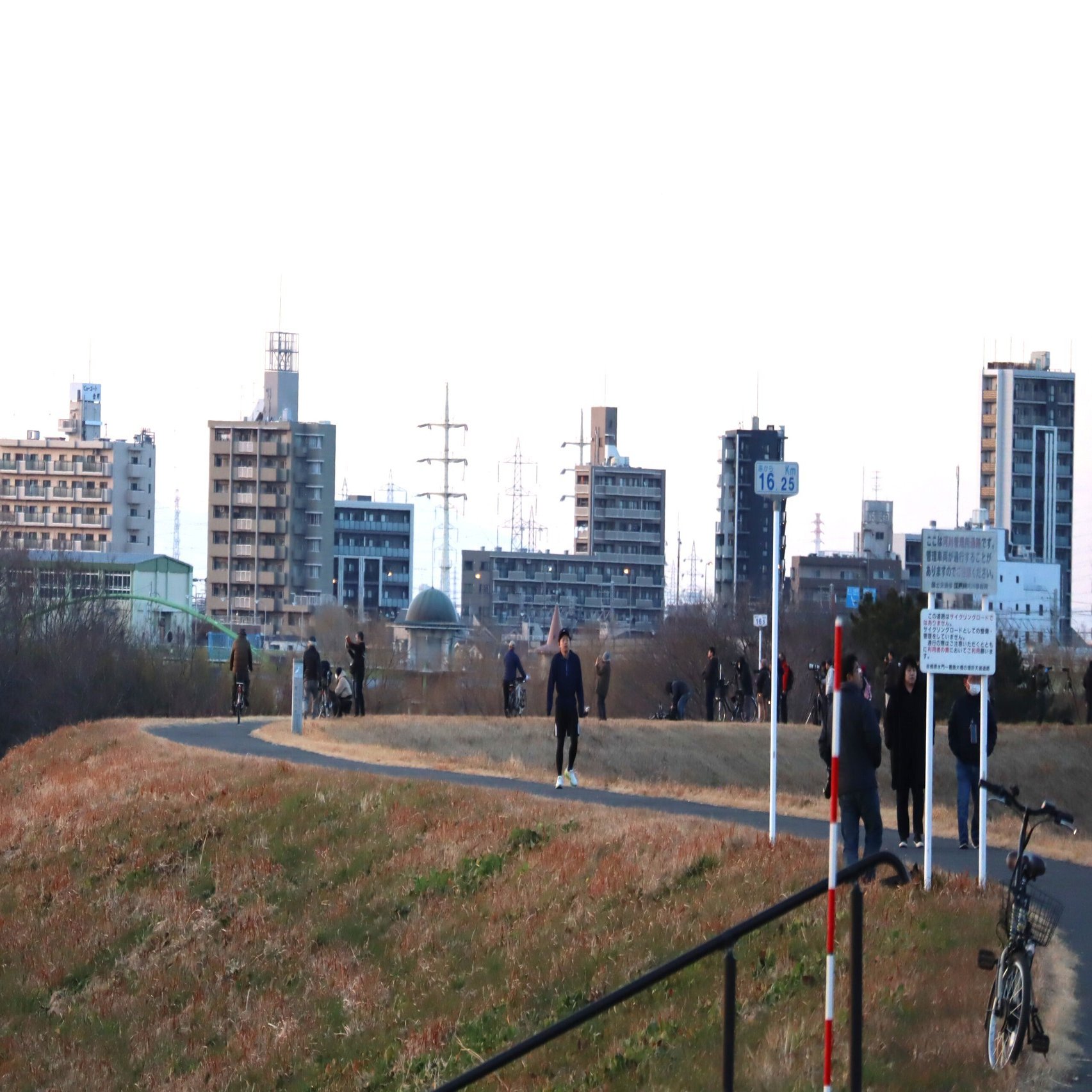 この日(1月31日)は、矢切地区の江戸川堤から「ダイヤモンド富士」を撮影できるスポットとして関心のあるカメラマンが撮影機器を携えて訪れていました。当日は、晴れ間もありましたが、あいにく落日時刻に雲が出て撮影できませんでした。