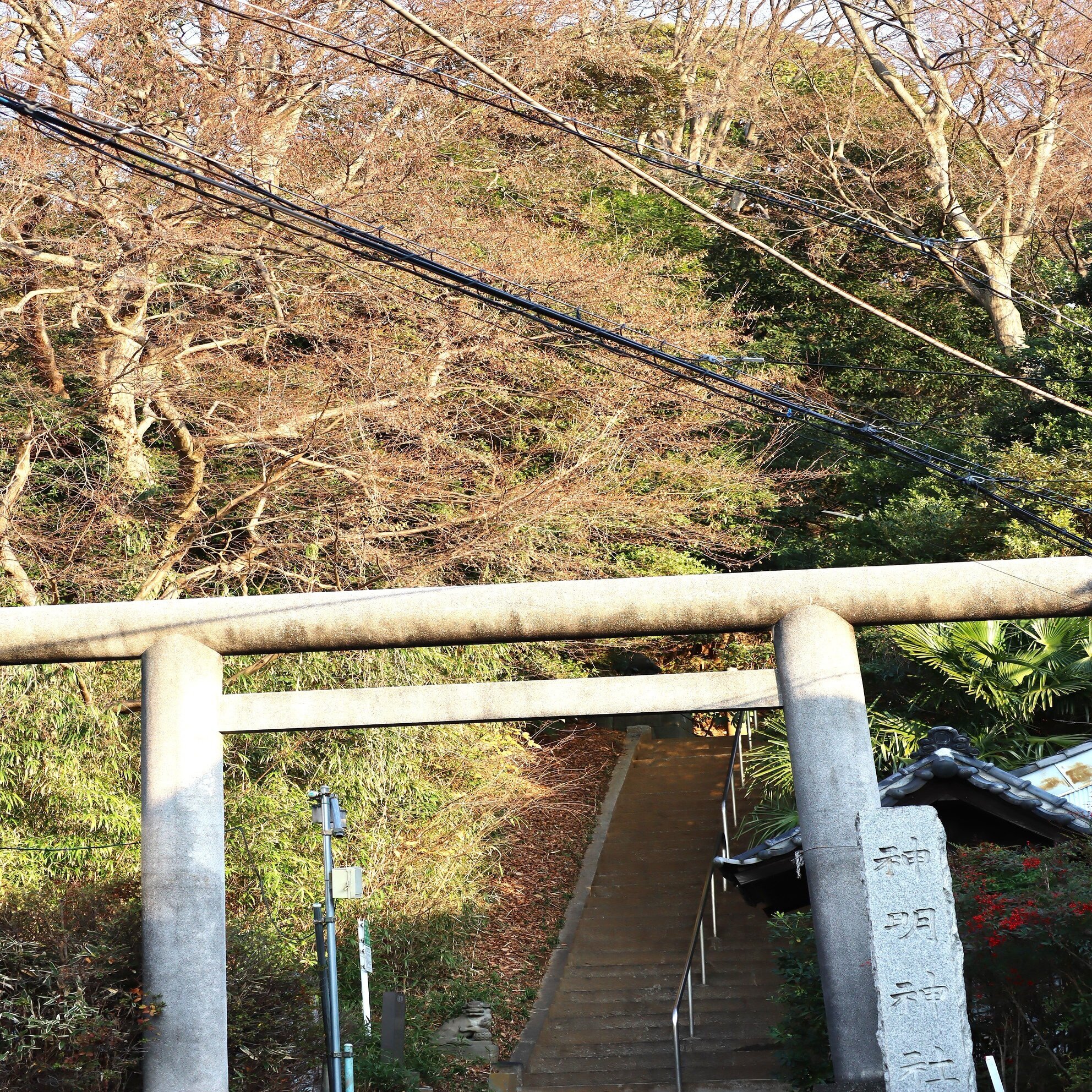 次の写真は斜面林下にある神明神社の鳥居です。斜面林に設けられた参道の階段を上り終えたところに神明神社の拝殿があります(同マップのマーカー参照)。