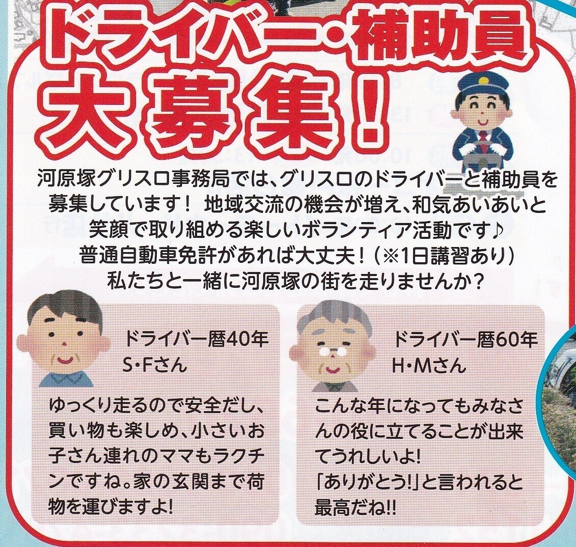 その役割を通して河原塚グリスロの運行運営に「若い力を注げる」方々に呼びかけをしています。グリスロ運行運営がよりスムーズにできるように、ともに進めていきましょう。